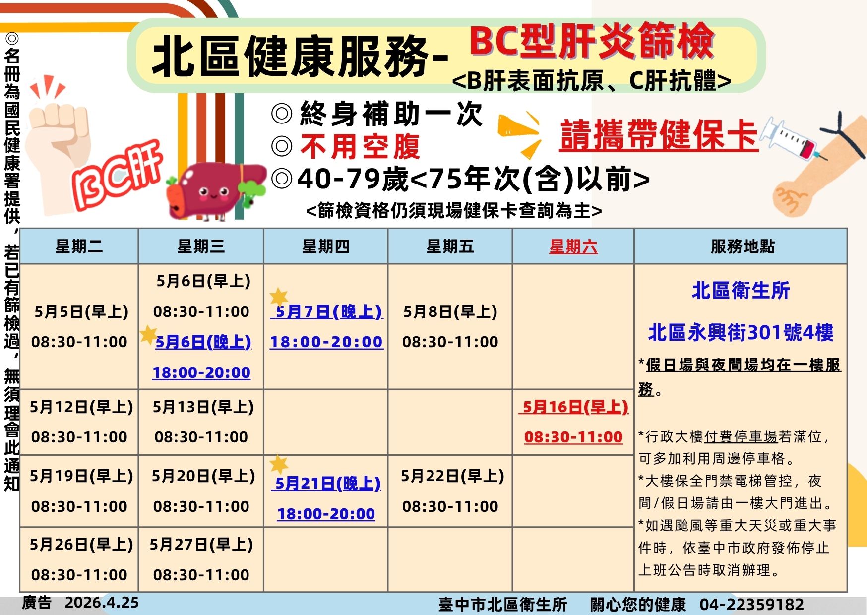 113莫德耐XBB (8) 北區衛生所於5月除固定每週二、週三 08:30–11:00 提供〈BC型肝炎篩檢〉服務外,亦將依文宣公告加開其他篩檢場次。符合資格的民眾記得攜帶健保卡,把握時間前來篩檢,早期發現、早期追蹤,守護自己的健康!💪 ✅ 終身補助一次✅ 不用空腹✅ 40–79歲<75年次(含)以前> 📍地點:北區衛生所⏰服務時間:依文宣場次辦理